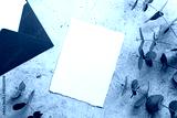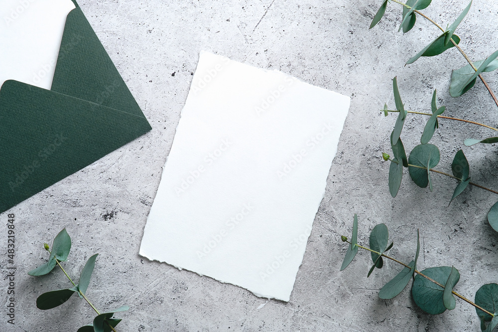 Blank paper card mockup and eucalyptus branches on rough stone surface top view. Wedding invitation card design, RSVP template.