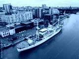 various military and research ships on the Pregolya River in the port of Kaliningrad,
