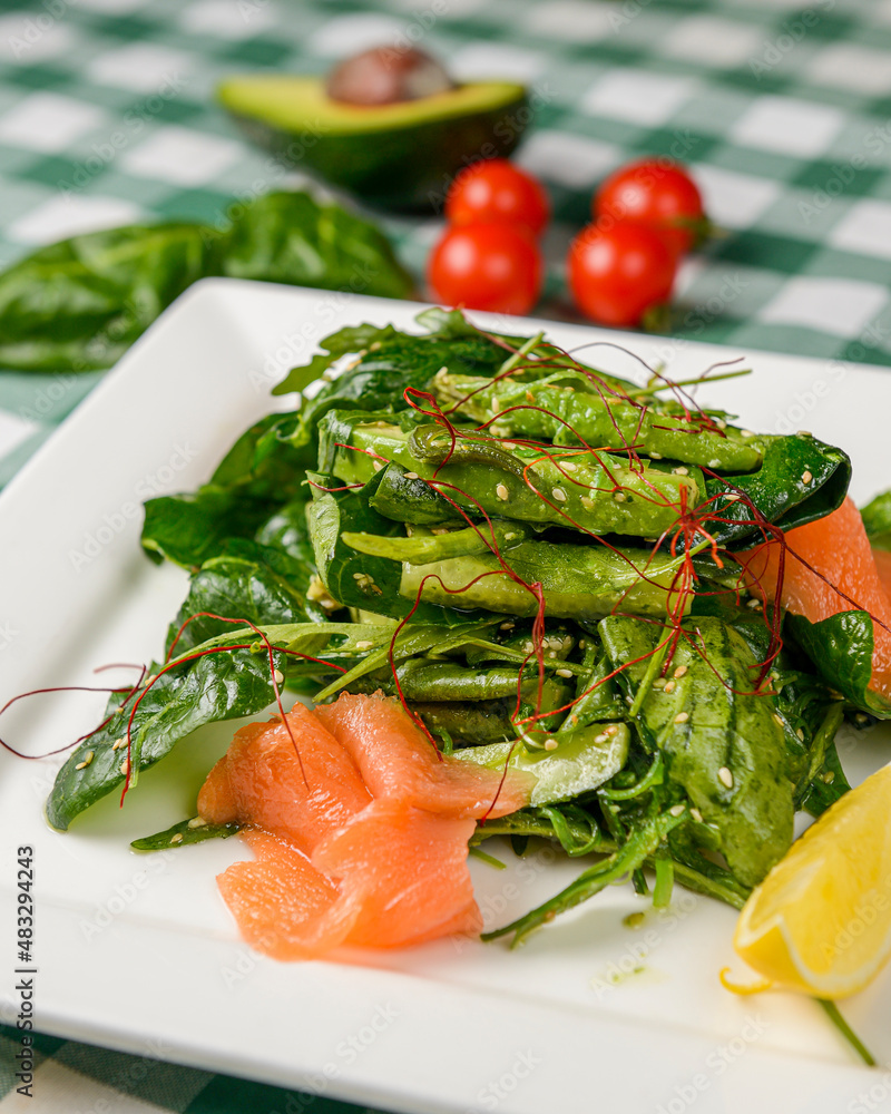 Salmon salad - smoked salmon and vegetables on a white plate on table. Healthy eating concept.
