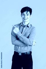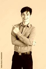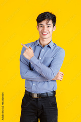 Portrait studio shot of millennial Asian young male professional successful businessman entrepreneur in formal shirt and slacks standing posing on yellow background.