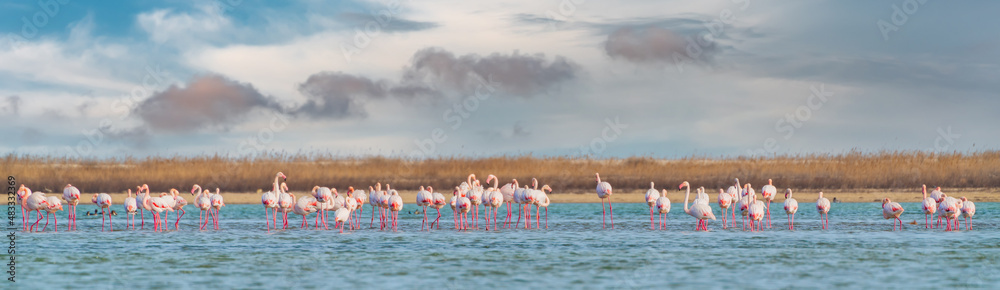 Flock of pink flamingos walking and feeding in the blue water