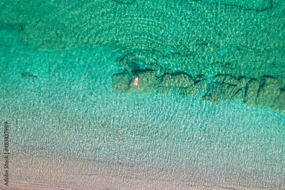 Top, aerial view. Young beautiful woman in a hat and white bikini swimming in sea water on the sand beach. Drone, copter photo. Summer vacation. View from above.