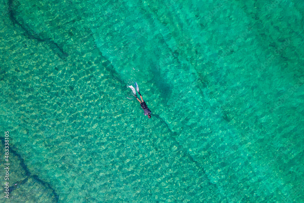 Spearfishing scuba diver in tropical exotic sea, ocean turquoise clear water. Man swimming hunting exotic fish, poaching. Top view. Aerial, drone, copter view.