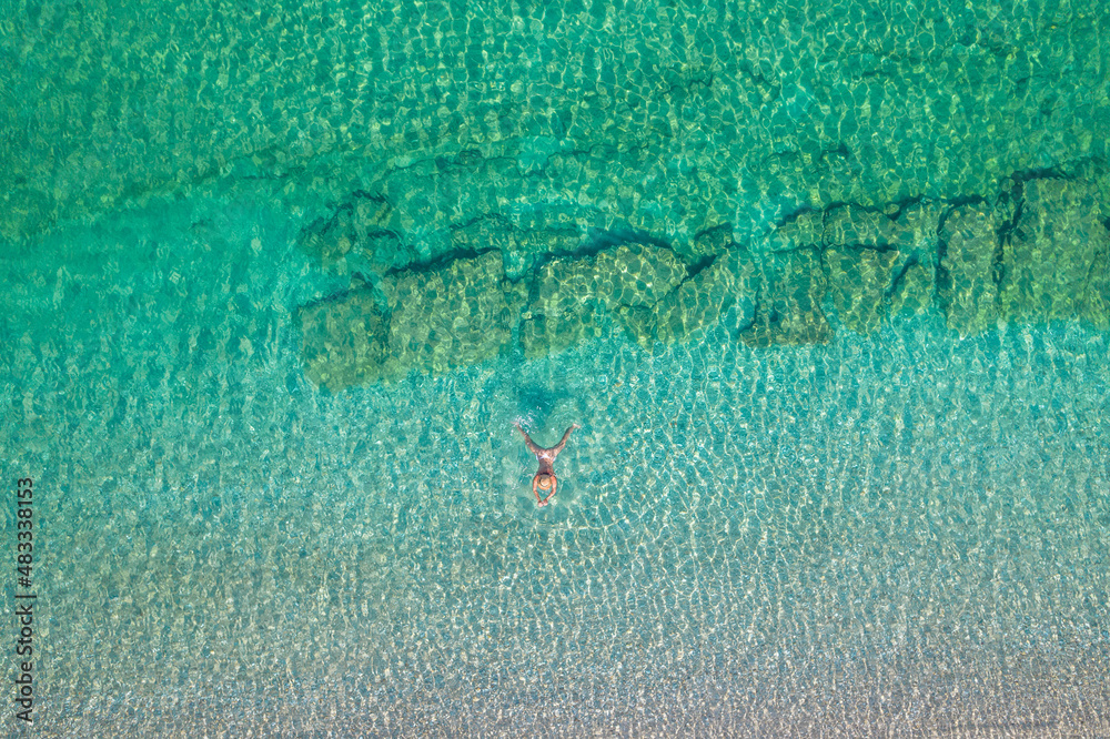 Top, aerial view. Young beautiful woman in white bikini swimming in sea water on the sand beach. Drone, copter photo. Summer vacation. View from above.