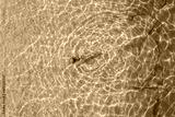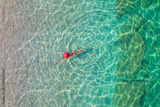 Top view. Young beautiful woman in a red hat and bikini swimming in sea water on the sand beach. Drone, copter photo. Summer vacation. View from above.