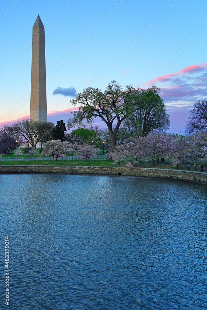 Night view of the Washington Monument obelisk in Washington DC during cherry blossom season