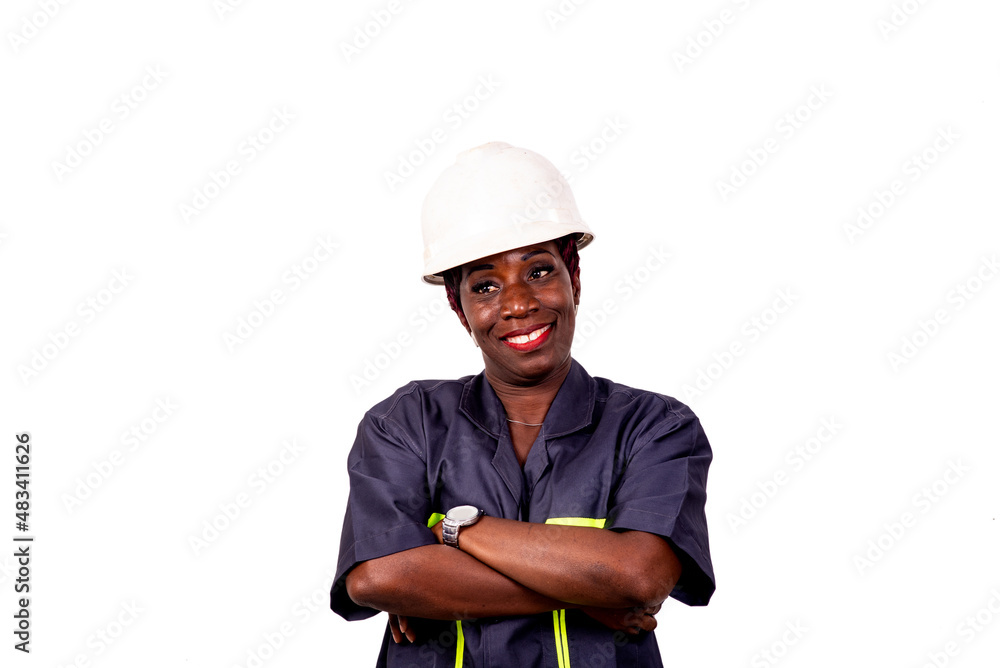 portrait of a beautiful adult female engineer crossing her arms smiling.