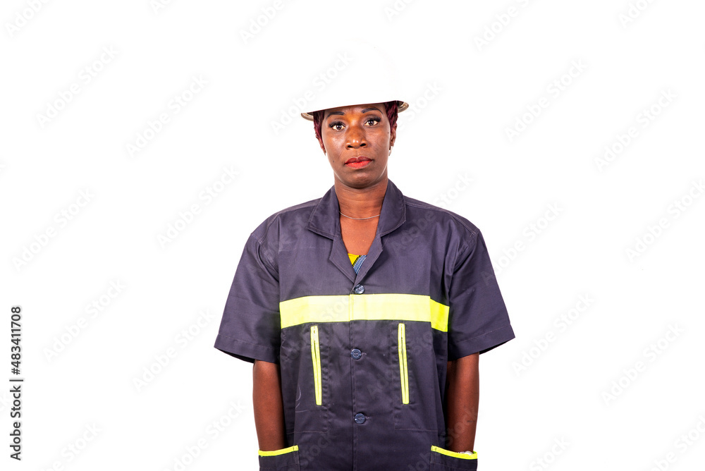 portrait of a beautiful adult female engineer holding her hands in her pockets smiling.