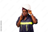 beautiful adult female engineer talking on mobile phone.
