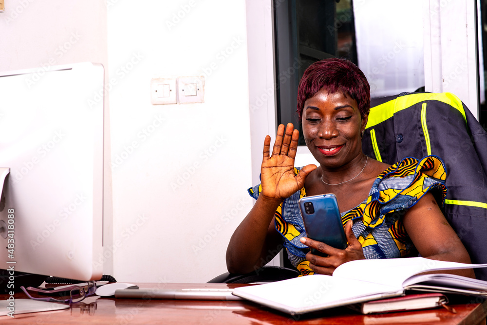 beautiful adult business woman waving hand during video call on mobile phone.