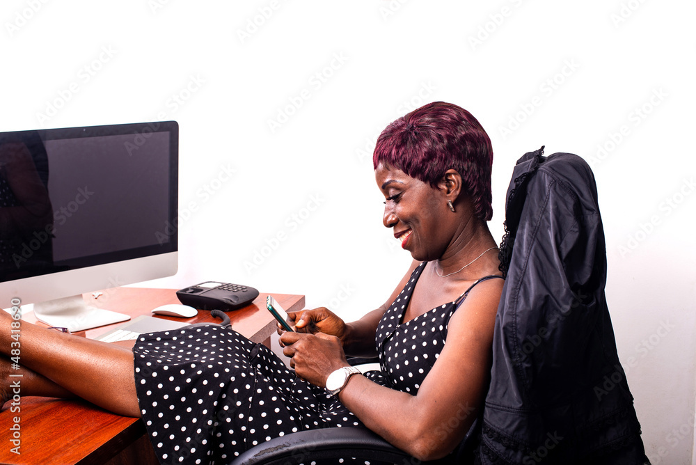 beautiful adult business woman chatting on mobile phone in office smiling.