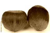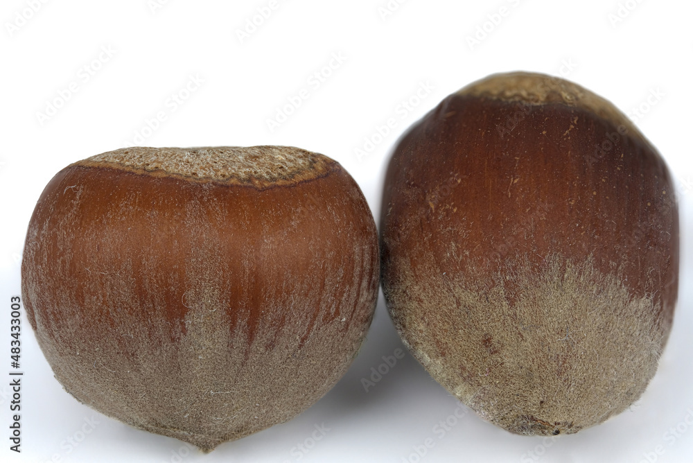 Hazelnuts isolated on white background. Macro shot of two unpeeled and whole hazelnuts.