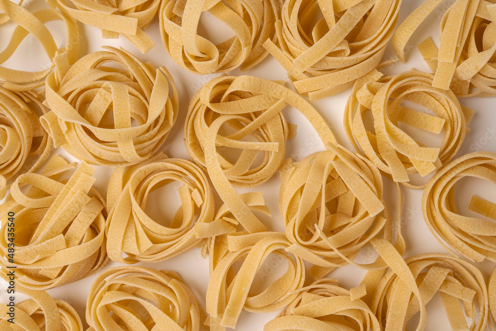 Raw tagliatelle , nest pasta, Egg pasta nests lying in a pattern on a white background, the pattern is a top view