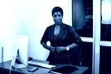beautiful adult businesswoman buttoning her jacket in the office smiling.