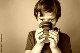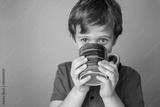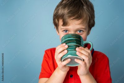 A cute Caucasian boy in a red T-shirt drinks from a mug and smiles fervently looking at the camera.