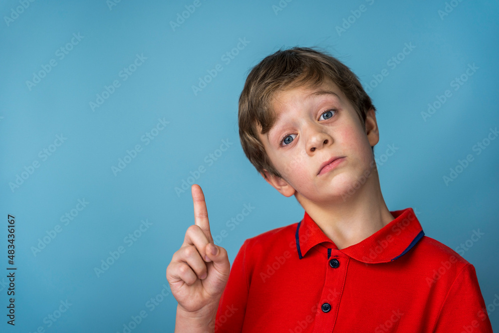 A cute Caucasian boy of 5 years old in a red T-shirt thoughtfully, seriously and edifiingly points his finger up