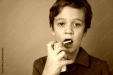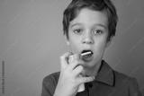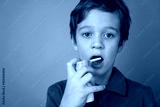 Caucasian boy sprays an aerosol into his mouth to treat sore throat, spray for topical use. aerosol inhaler