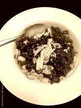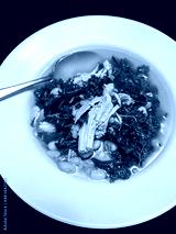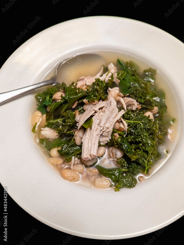 Chicken kale soup in the white flat bowl with a silver spoon, top view