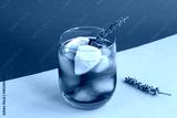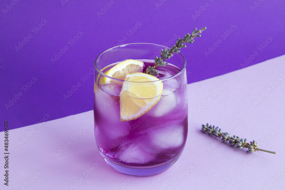 Lavender lemonade with ice and lemon in the drinking glass on the purple background. Close-up.