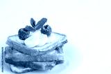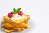 Close-up on french toasts with banana and raspberry on the white plate on the white background. Copy space.
