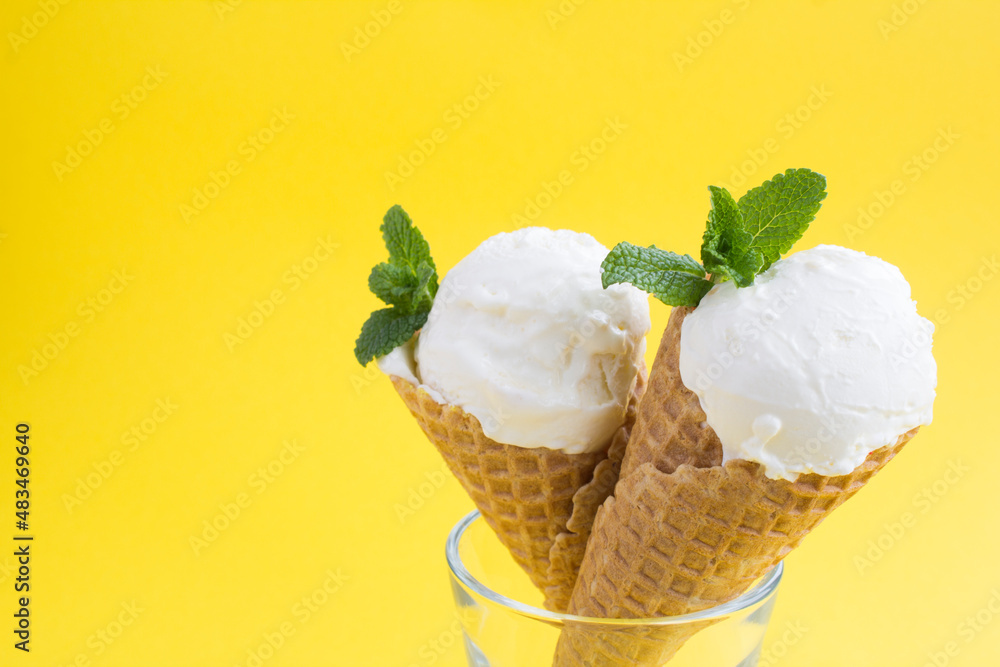 Close-up on vanilla ice cream in a waffle cone on the yellow background. Copy space.