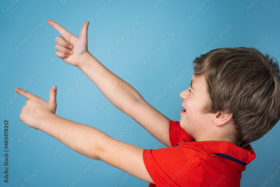 boy cheerfully shoots his fingers folded into the shape of a pistol. the boy put his fingers in the shape of a gun
