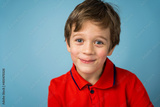 A cute 5-year-old Caucasian boy in a red T-shirt looks at the camera and smiles