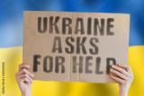 The phrase " Ukraine asks for help " on a banner in men's hand with blurred Ukrainian flag on the background. Battle. Combat. Tension. Voice. Aggression. Violence. Relationship. Society. Relation