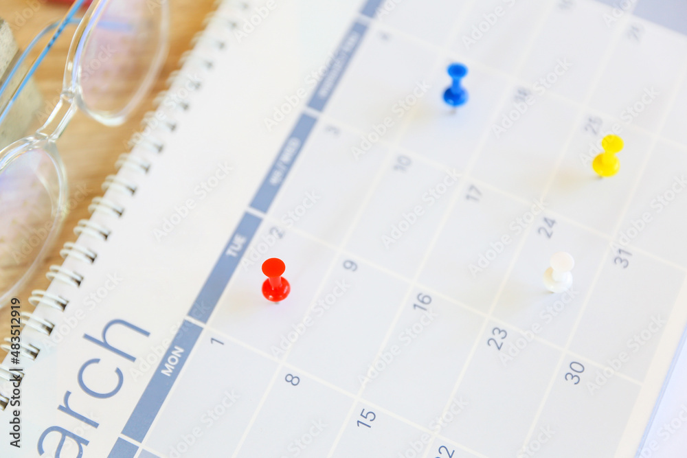 Calendar, Close-up red pin on blank desk calendar with office equipment concept of event planner or personal organization for business and appointment reminder and schedule planning.