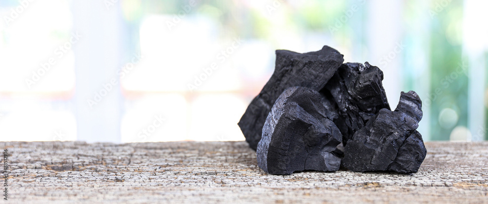 Natural black wooden charcoal or traditional hard wood charcoal stack with background.
