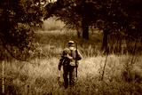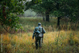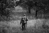 Single Re-enactor Dressed As German Wehrmacht Infantry Soldier In World War II Walking In Patrol Through Autumn Forest. WWII WW2 Times.