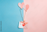 Congratulations on Valentine's Day. An envelope with a heart flying on two heart-shaped balloons is pink.