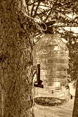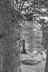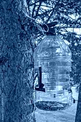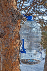 Bird feeder made from a plastic bottle on a pine branch on a winter day