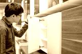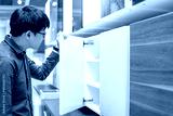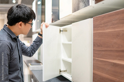 Asian man opening wooden cabinet door in furniture store choosing material to buy for house decoration. Home improvement concept