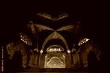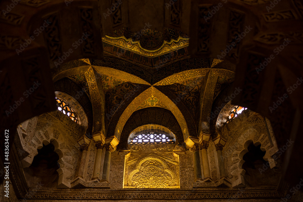 CORDOBA, SPAIN - August 11, 2021: mosaic-decorated archs in the Mosque-Cathedral of Cordoba, Andalusia, former Islamic mosque, it is also known as the Mezquita. One of Symmetric image.