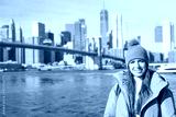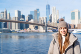 NEW YORK CITY WOMAN ENJOYING MANHATTAN VIEW FROM BROOKLYN PARK LIVING HAPPY DURING WINTER TIME IN UNITED STATES. TRAVEL, SUNNY DAY AND AMERICA CONCEPT.