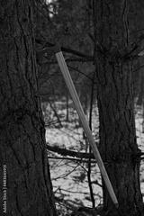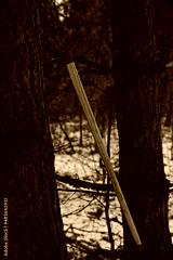 Góralska ciupaga ( bojowy topór ) wbita w pień sosny .
