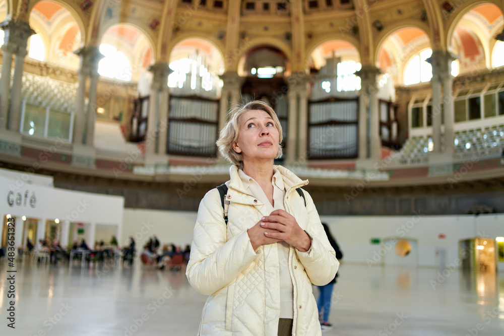 portrait of elegant woman wearing masks modern art gallery