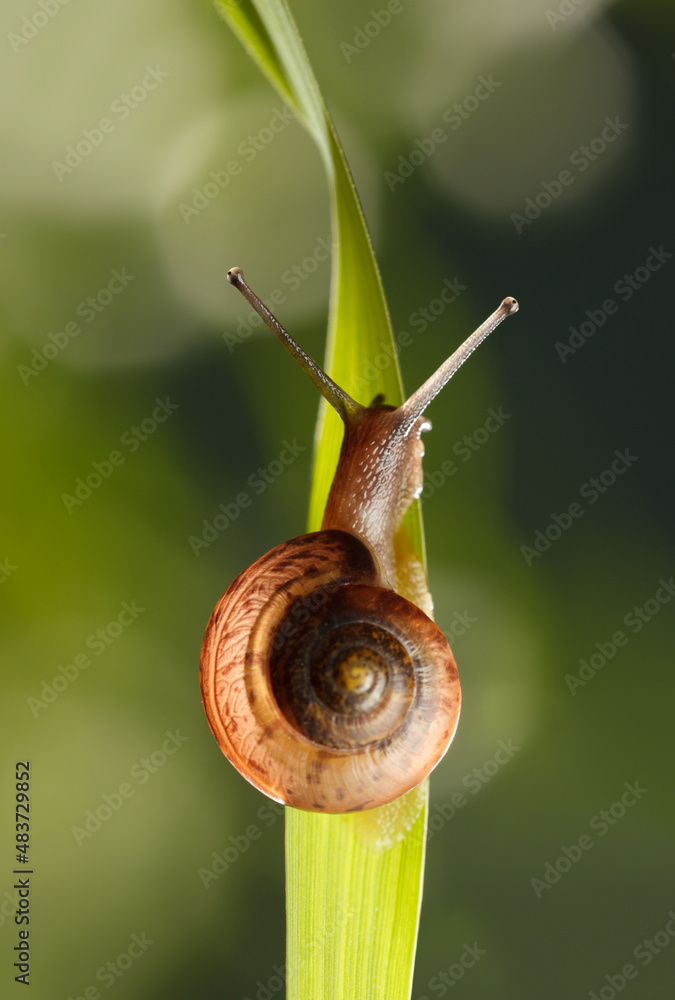Snail climbing up on grass leaf
