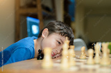 Selective focus Happy Young boy developing chess strategy, playing board game with parent at home. Activity or Hobby for Family Concept
