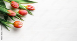 Bouquet of red tulips on a white wooden background. Top view. Copy space