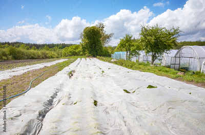 Eco farm with nonwoven agrotextile covering plants, focus on the foreground.