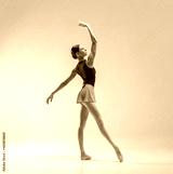 Young and beautiful ballerina in purple ballet leotard and grey skirt. She wears ballet pointe shoes and dancing in white studio.