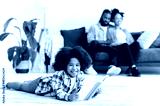 Happy African American family. Little cute African American girl, preschooler, lies on the floor in living room with a book in hands, looks at camera, smile, parents on the background sit on the couch