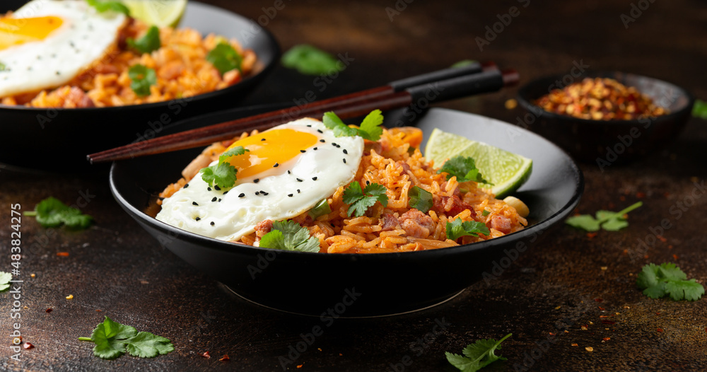 Kimchi fried rice with fried egg and bacon. Korean food