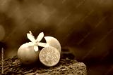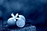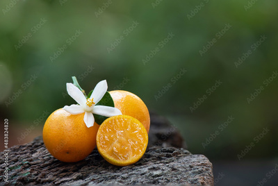 Kumquats or Citrus japonica fruit and neroli on nature background.