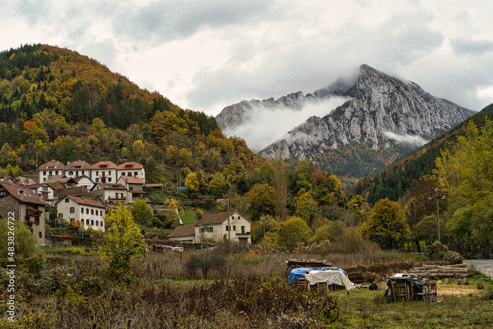 autumnal view of the town of Isaba with the mountain and its peak in the background surrounded by clouds, in the Navarrese Pyrenees