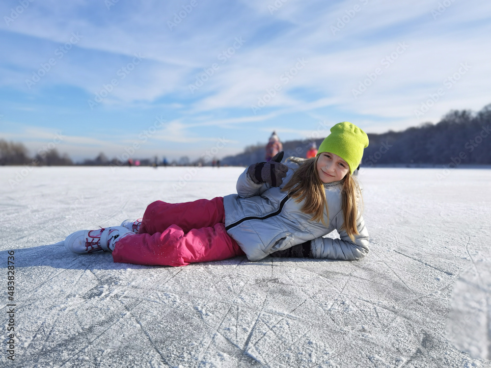 Adorable little girl skating on ice rink outdoors