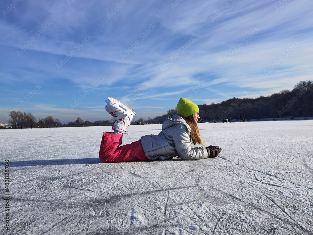 Adorable little girl skating on ice rink outdoors