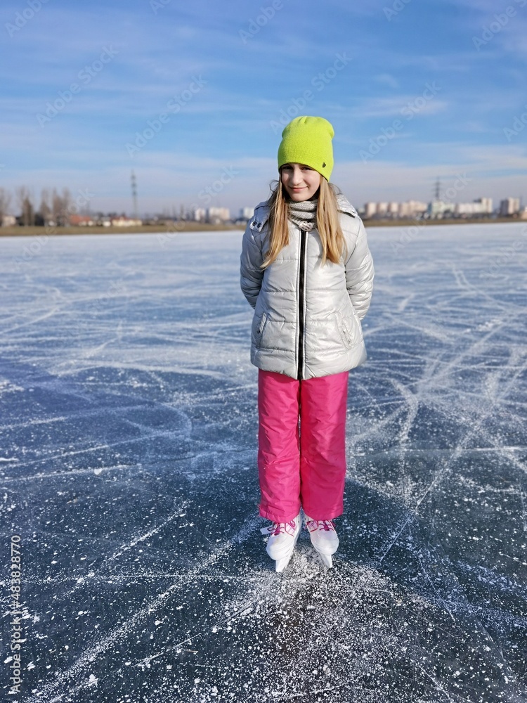 Adorable little girl skating on ice rink outdoors